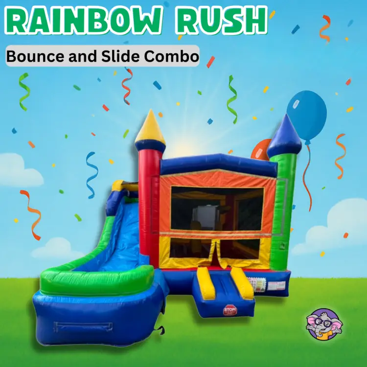 Get ready to experience endless fun with the Rainbow Rush Combo! This exciting inflatable combines the best of both worlds — a spacious bounce house and a thrilling slide — all wrapped in a bright, colorful design that kids love. With its castle-style towers and bold red, blue, green, and yellow colors, Rainbow Rush instantly becomes the centerpiece of any party.