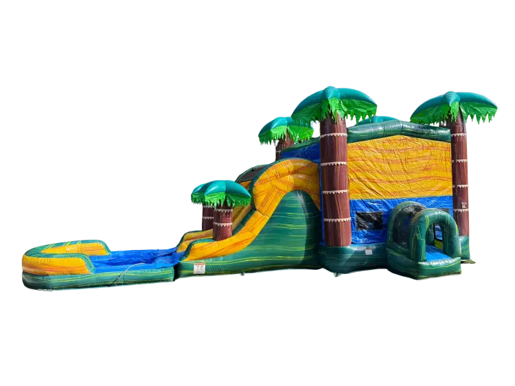 Bring tropical excitement to your next event with the Palm Island Dual Lane Bounce & Slide (Wet or Dry) from Marques Amusement Company. This eye-catching inflatable features towering palm trees, a spacious bounce area, a climbing wall, and two exciting slides that allow kids to race side-by-side into the splash pool.