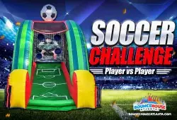 Our Soccer Challenge inflatable game puts players in competitive mode. Participants take their shot at the back wall and try to get it past the goalie to score points through the different openings. The soccer ball then returns to the player's lane. The fast-paced inflatable game includes soccer field artwork in the background that brings the sport to your own backyard!